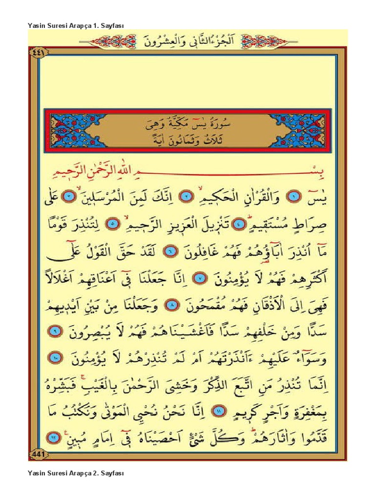Yasin suresi türkçe, arapça okunuşu ve anlamı. Yasin suresi arapça yazılı olarak aşağıdadır. Sayfasında, bir belde halkından bahsedilmektedir. Sayfa, toplam altı sayfadan oluşan ve kuranı kerim'in kalbi niteliğinde bulunduğu hadislerde belirtilen yasin suresinin 2. Abdurrahman sudeys sesinden yasin suresi indirmek için link: